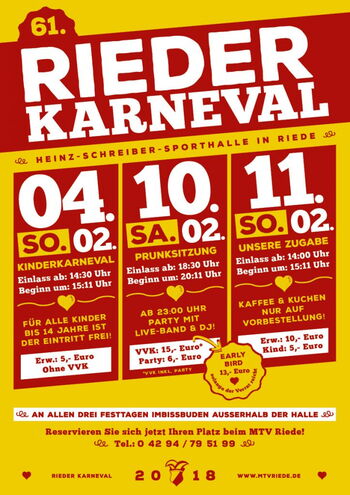 Karneval am Nachmittag mit Kaffee und Kuchen. Einlass ist um 14 Uhr, der Beginn der Vorstellung 15.11 Uhr. Der Eintrittspreis beträgt für Erwachsene 10€ und für Kinder 5€ das Kuchebuffet und der Kaffee werden separat nur gegen Vorbestellung angeboten.